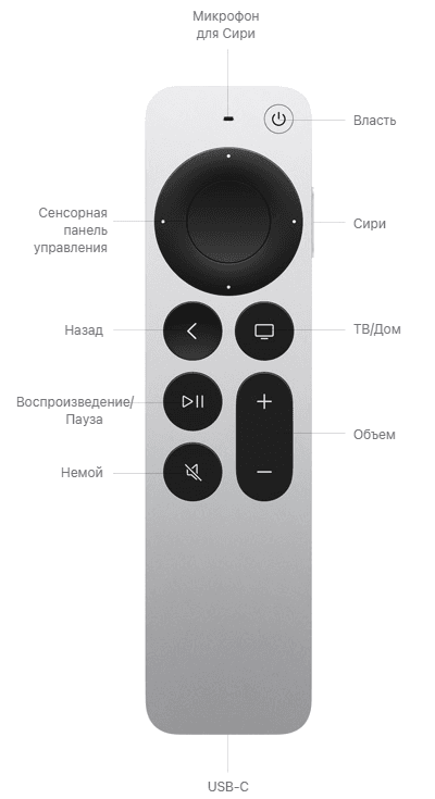 Управлять всем этим проще простого. В коробке — пульт Siri Remote (3-го поколения) с разъемом USB‑C. Проводите пальцем по сенсорной панели, попросите Siri включить что-нибудь интересное, а если пульт вдруг затерялся в диване — ваш iPhone поможет его найти.